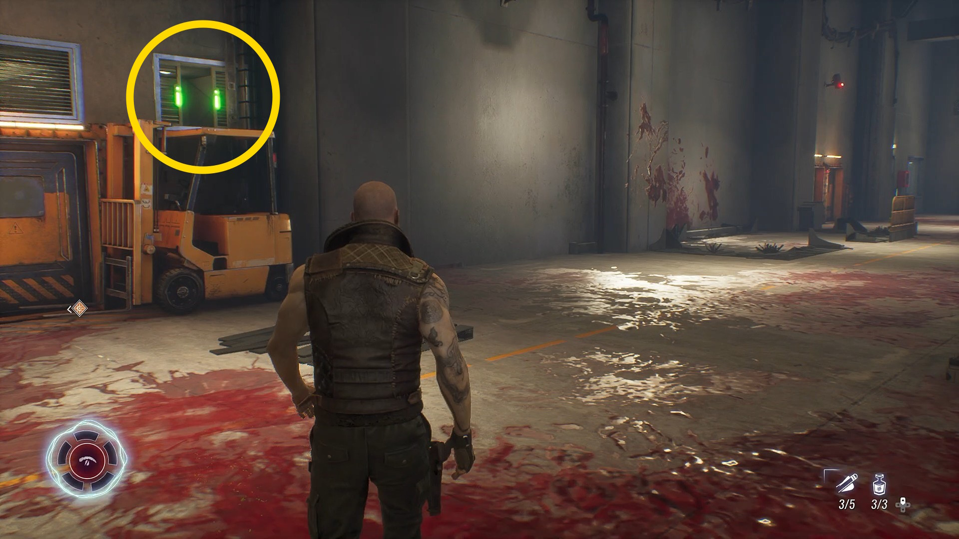 - 殲滅後、倉庫内の奥の壁際にフォークリフトが停まっている