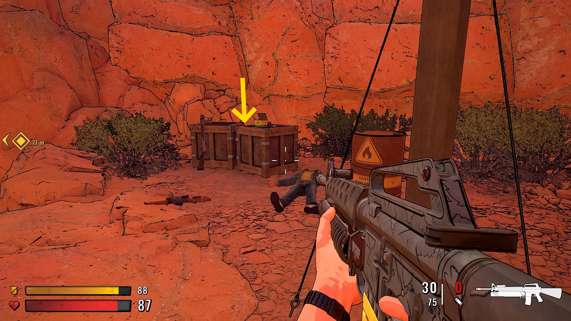 - 少し進むと木箱が見え、そこにアーマーやスナイパーライフルがある