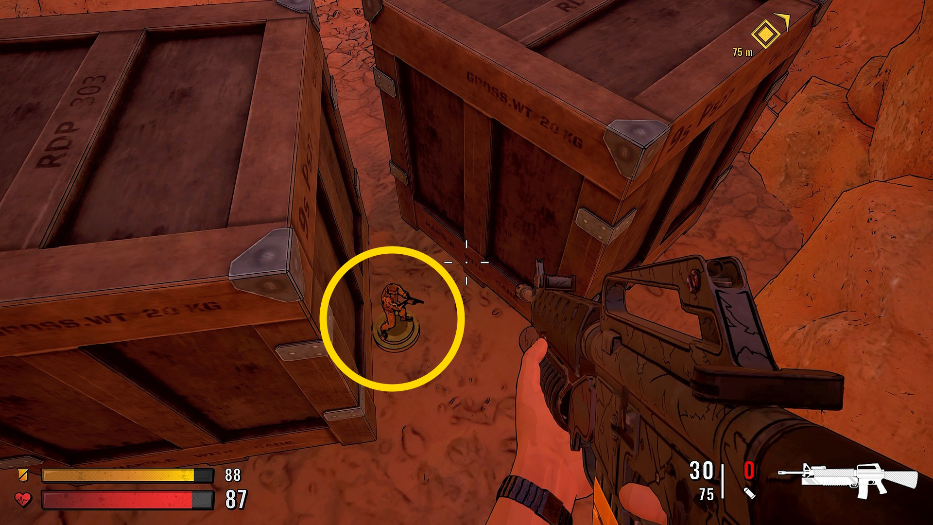 - 取ろうとするとワイプが入り、その先の崖上に2人の敵がいることを教えてくれる(1人は RPG 持ち)