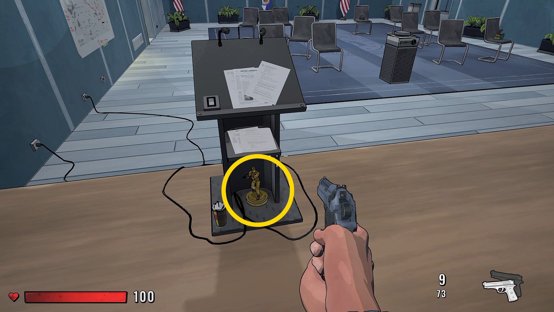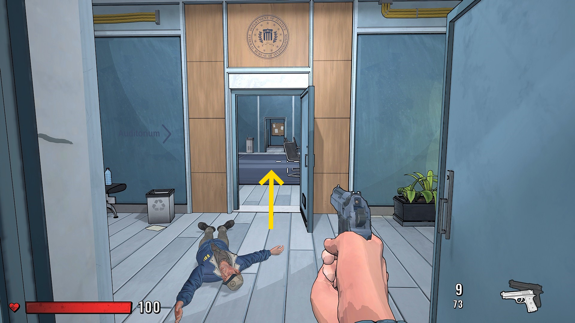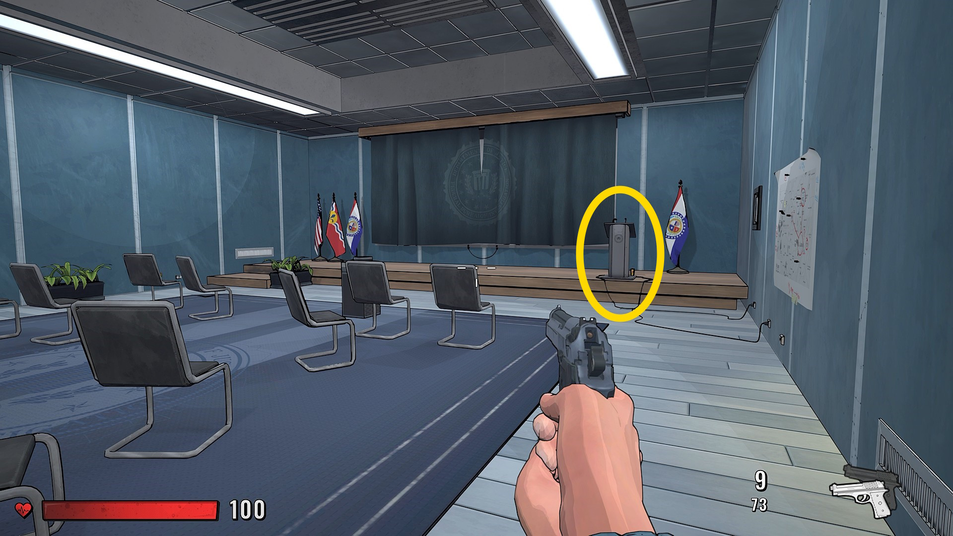 - 講堂に入ってきて反対側のドアから出ようとすると撃たれる FBI 捜査官