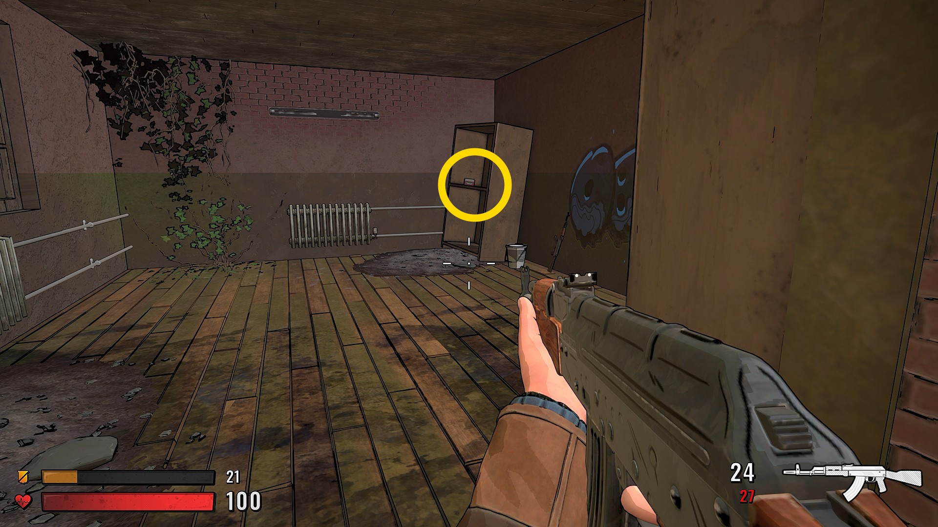 - 廊下の突き当り、ギャングたちが爆破して侵入してきた穴があるのでそちらへ