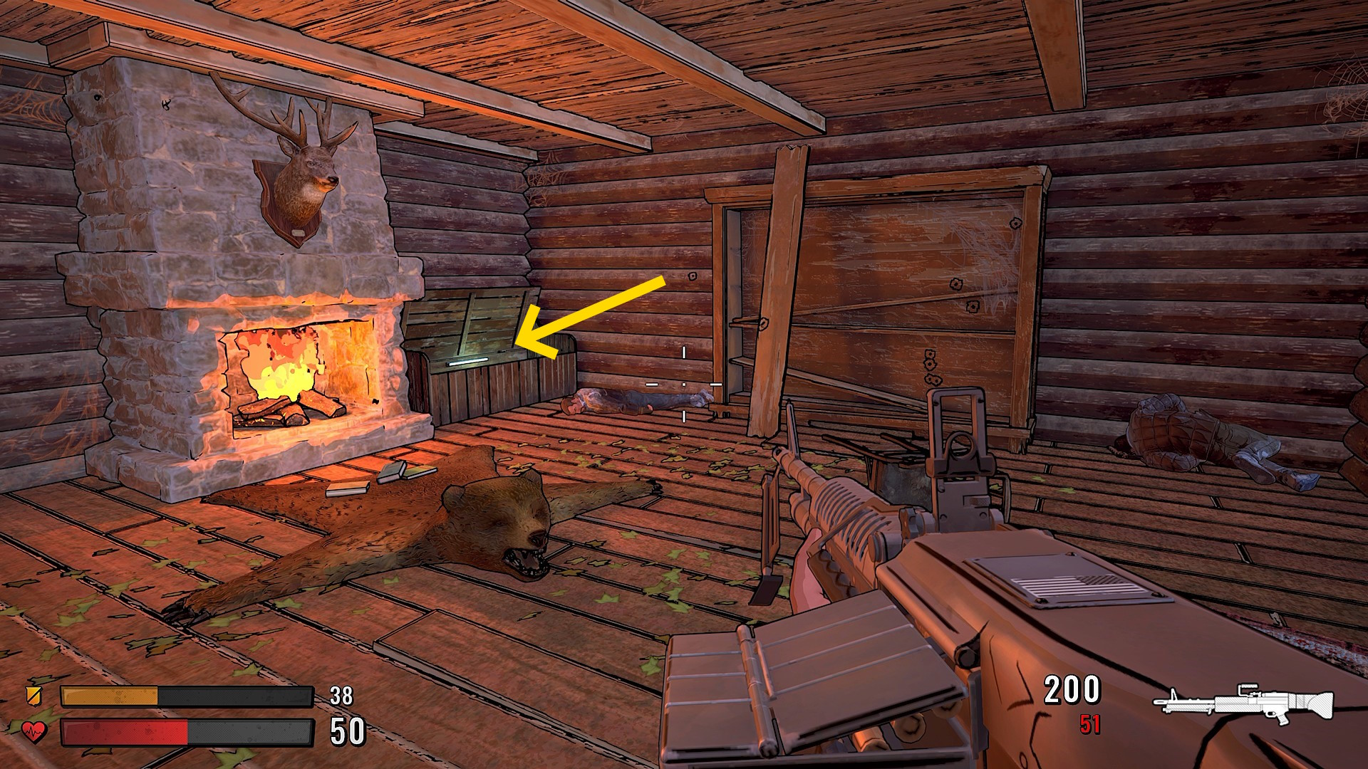 - さらに暖炉の右側、ベンチ型の収納を開けると M60 が入っているので回収しておこう