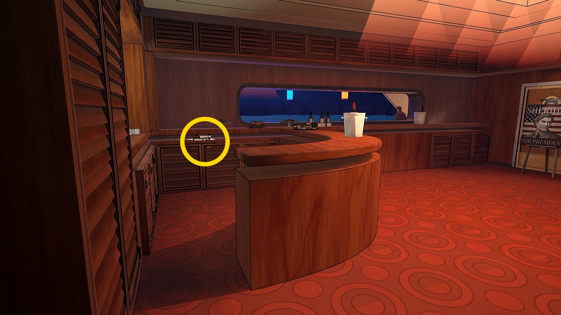 - シェリダンのワイプが表示され、階段の手前左側のドアを開けて船室に入る
