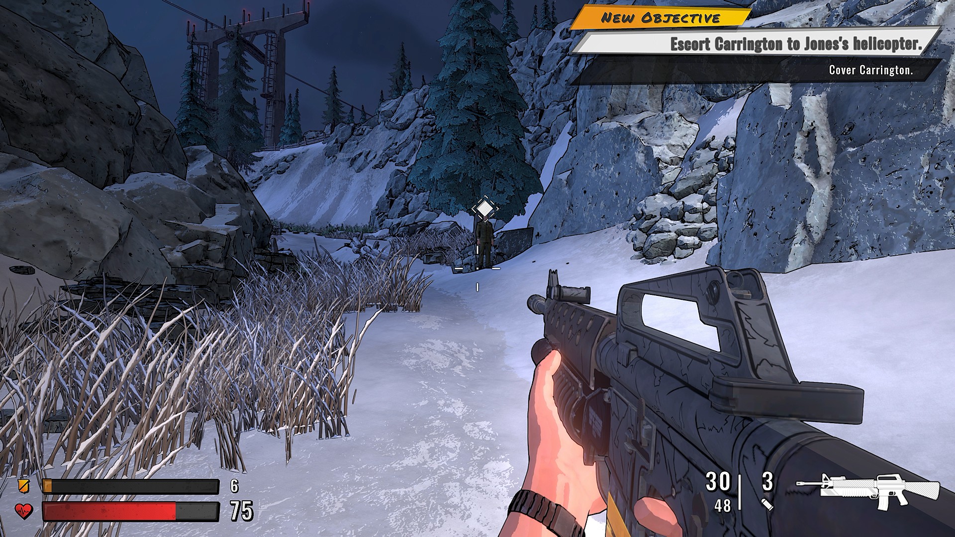- その間、キャリントン将軍は小さな洞穴の前に待機しており、この洞穴の前に進むと再び崖上に RPG 持ち1人、サーティーンの周辺に3人の敵が出現。3人の敵は気づくと背後にいる場合があるので注意しよう