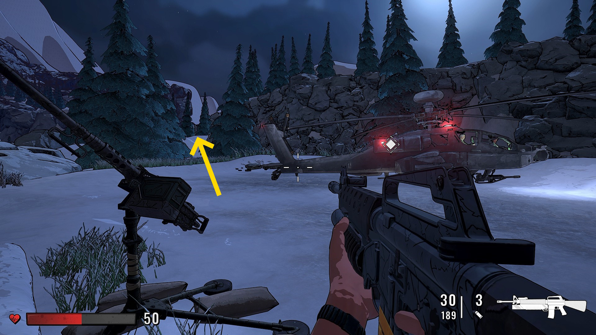 - 機関銃とヘリコプターを正面見て左前方に針葉樹がある