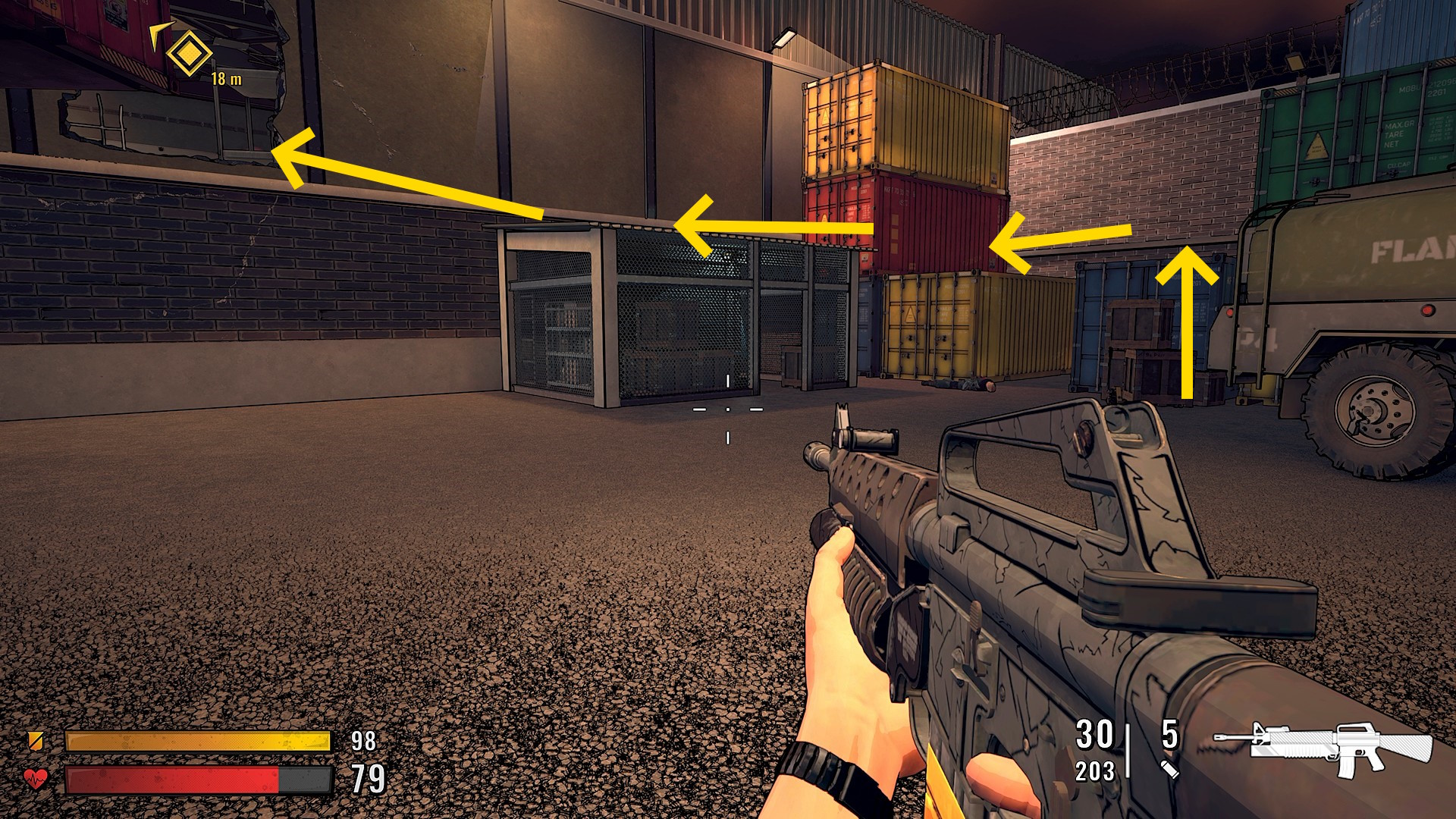 - 正規ルートを進むと「 Marylan Docks 」の看板がある2階建ての建物がある。2階部分を敵が巡回しているのが見えるが、窓ガラスは防弾仕様なので狙撃は無理