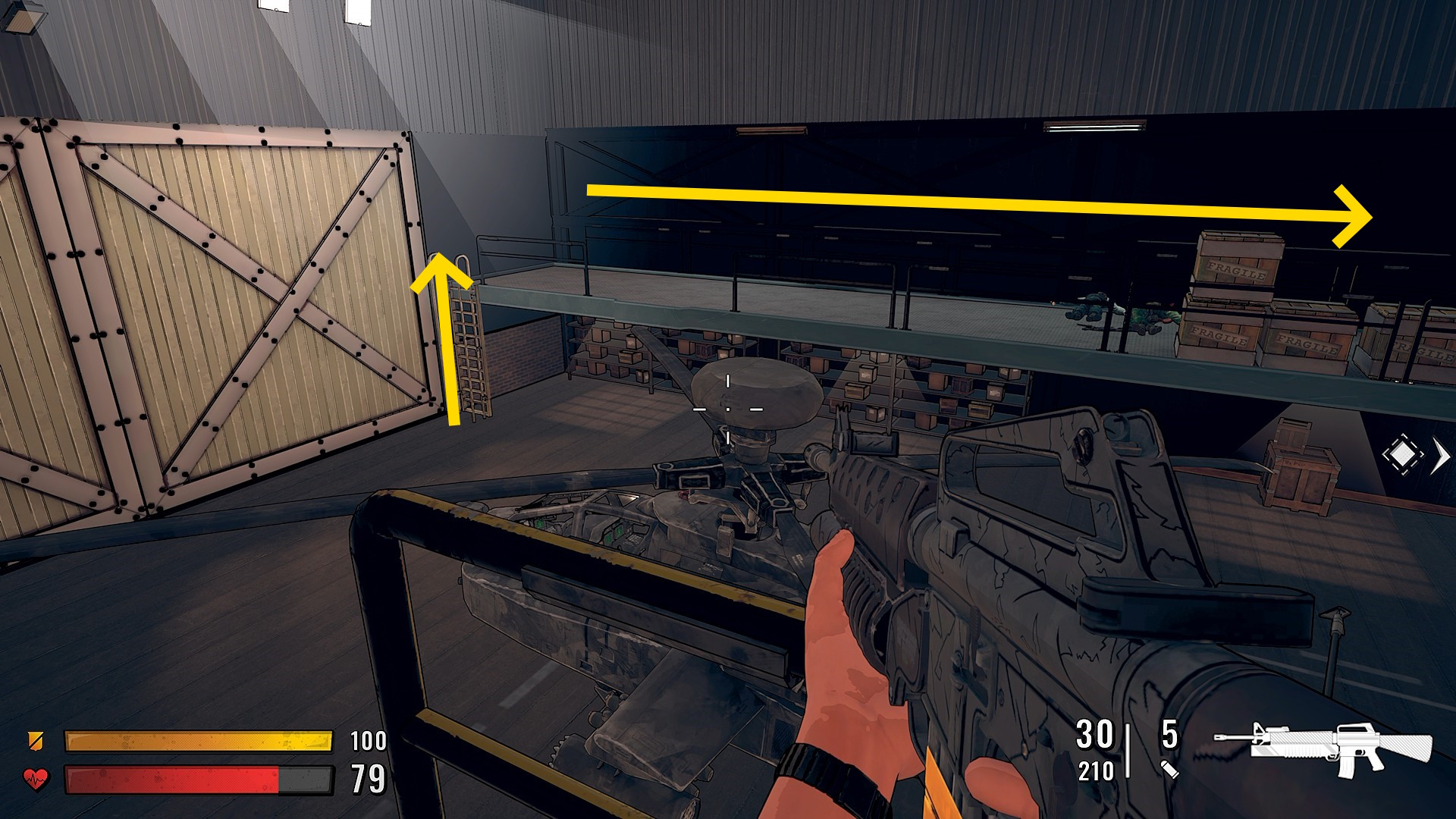 - はしごで2階にあがると敵が1人いるのでキル