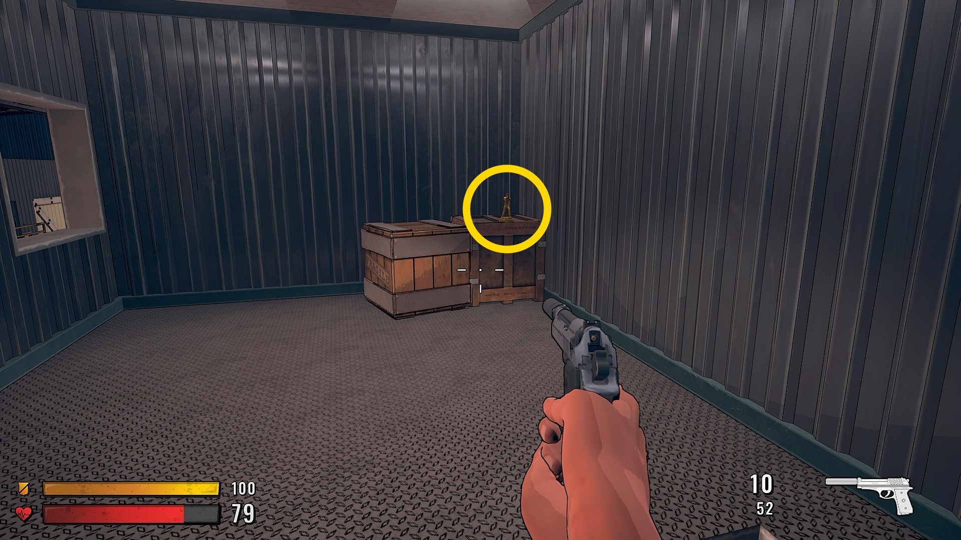 - 外に出たら、正規ルートは右だが、左前方に進むと木箱にスナイパーライフルの弾薬あり