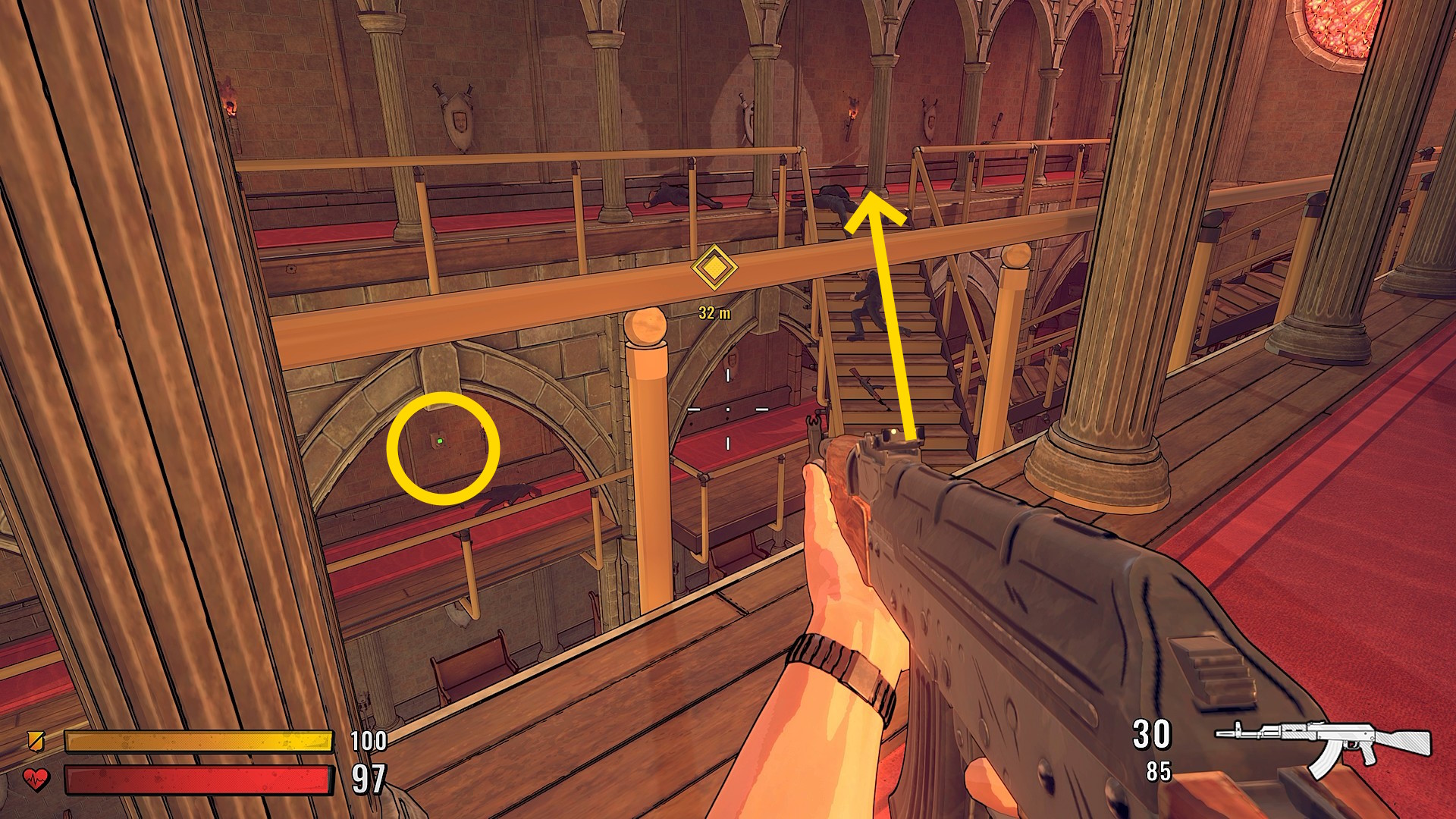 - マーカーを追って廊下に出ると右手の階段の下に敵が1人いるのでキル