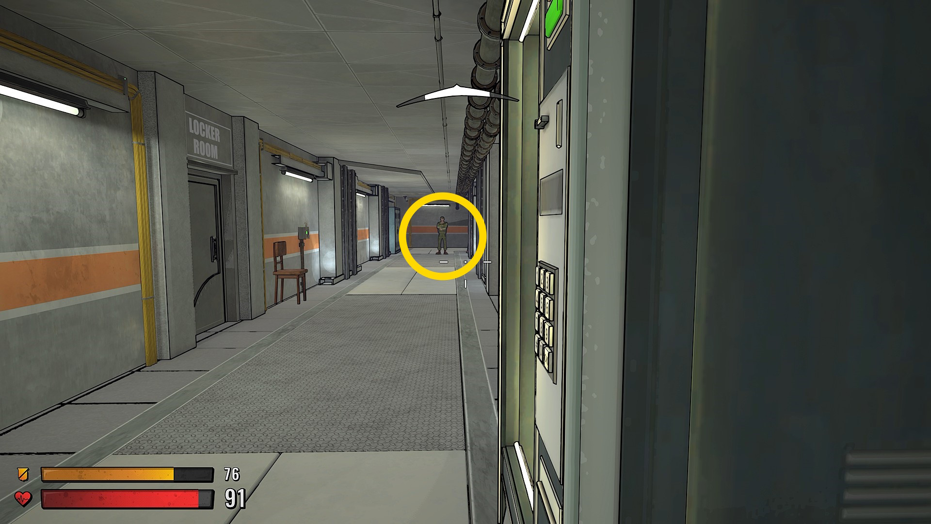 - 廊下の右前方のロッカールームのドアが開き敵が出てくる